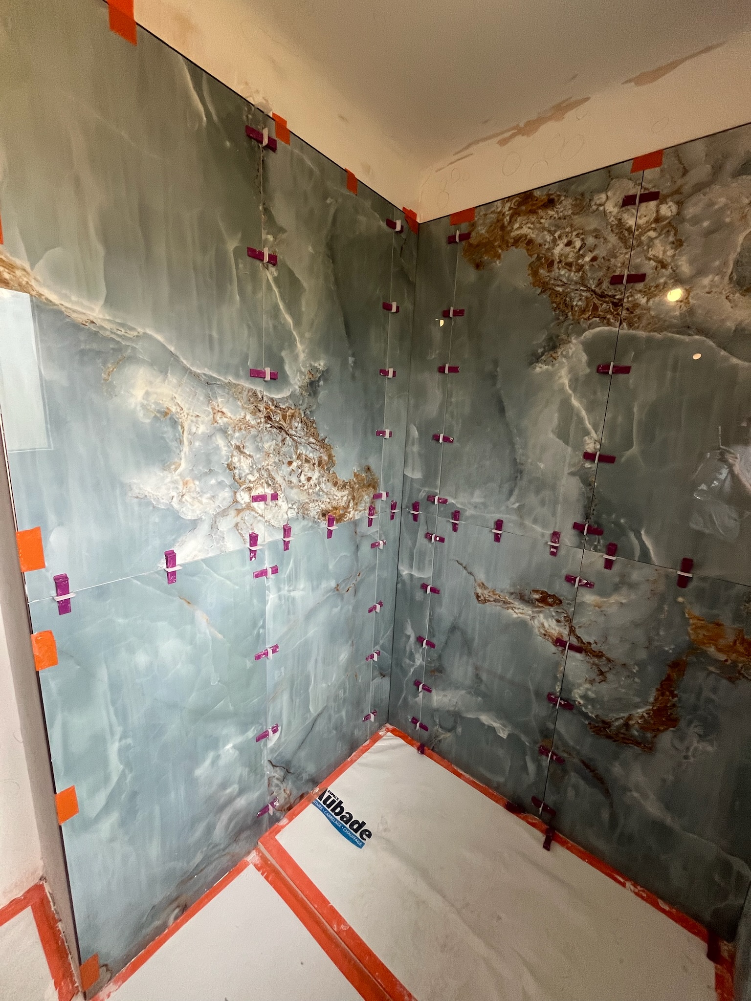 Au démarrage de ce projet, le coup de cœur de nos clients pour ce magnifique carrelage mural au style minéral qui rappelle l’eau et la nature (collection The Room, Imola Ceramica).