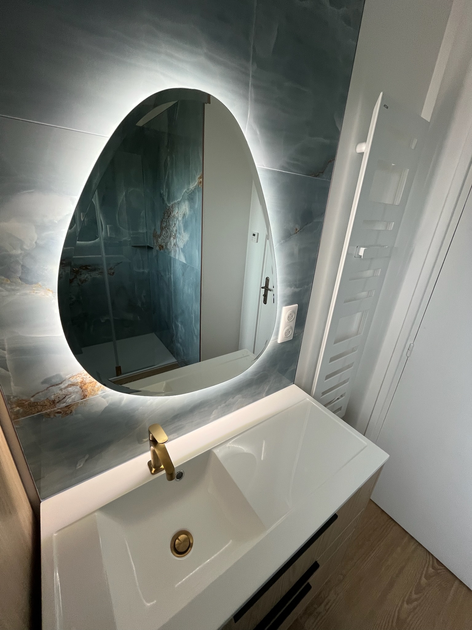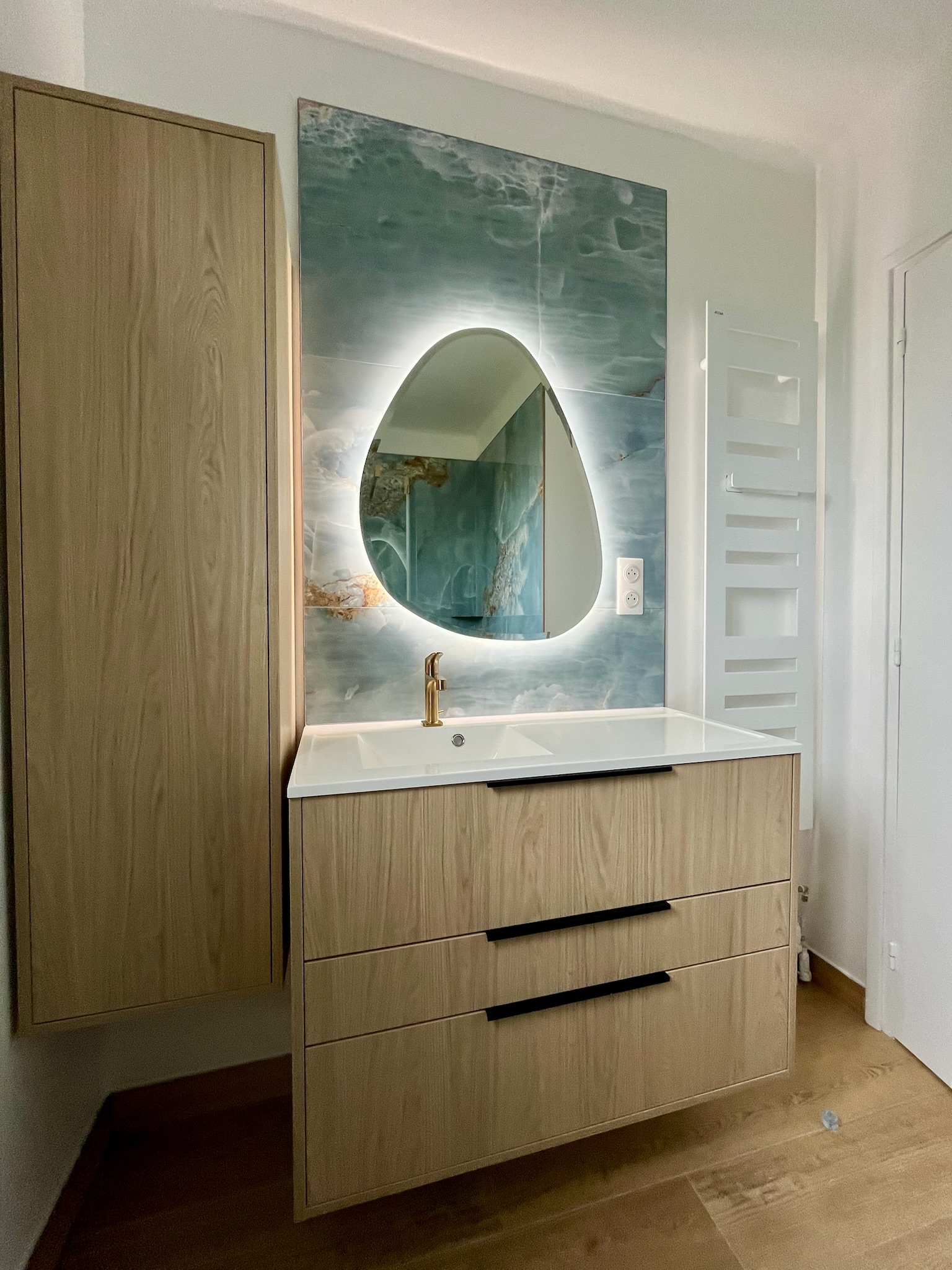 Ce résultat est l’alliance de matériaux chaleureux et de finitions raffinées. Les meubles en bois clair offrent de généreux espaces de rangement, tandis que le miroir rétro-éclairé aux formes organiques crée un jeu de lumière unique.