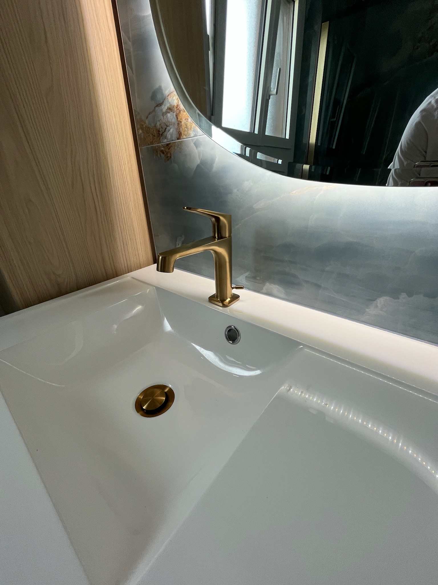 La robinetterie en or brossé apporte une note de sophistication, sublimée par le carrelage que nous retrouvons également dans l’espace douche.